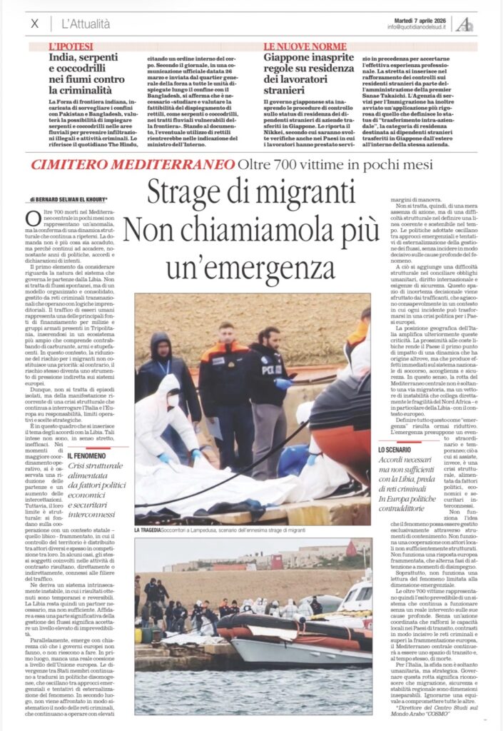 In una recente intervista a L’Altravoce, il direttore di COSMO, Bernard Selwan Khoury, ha analizzato ha analizzato la questione delle vittime in mare, sottolineando come le oltre 700 morti registrate nel Mediterraneo centrale non rappresentino un’anomalia, ma la conferma di una crisi strutturale e ricorrente.